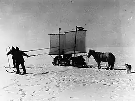 The wintering station was named "Borg", a name that had been suggested by Koch's wife after the farm of Egill Skallagrimsson in Iceland.[3] The meteorological and glaciological observations began almost immediately, the latter using ice-drilling equipment. Five of the ten ponies were slaughtered in order to preserve their meat for the winter. After settling down in their base the members of the expedition kept exploring a practicable way westwards across the ice. During such an exploration in early November Koch fell into a crevasse and broke his leg, which would take months of rest to heal. Fortunately the remaining part of the winter was quite uneventful and by early March Koch was able to take part in the surveys of Queen Louise Land that the expedition members carried out from their base until mid April.[1]