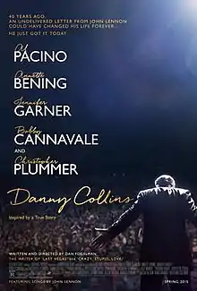 Danny Collins is a 2015 American comedy-drama film written and directed by Dan Fogelman in his feature directorial debut. Inspired by the true story of folk singer Steve Tilston,[5] the film stars Al Pacino, Annette Bening, Jennifer Garner, Bobby Cannavale and Christopher Plummer. The film was released in theaters on March 20, 2015.