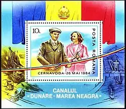 In June 1973, the project, with a completely new design,[3] was restarted by Nicolae Ceaușescu, who had previously ordered the rehabilitation of people sentenced in the 1952 trial,[5][11] and who aimed to withdraw the Lower Danube from Soviet control (which had been established by the 1948 Danube Conference).[2][4] In official propaganda, where the 1950s precedent was no longer mentioned,[4] the canal was referred to as the Blue Highway (Magistrala Albastră).[4][11]