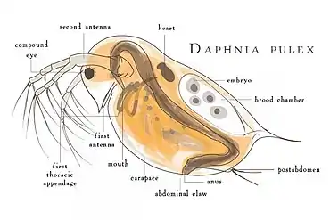 The body of a Daphnia species is usually 1–5 mm (0.039–0.197 in) long,[2] and is divided into segments, although this division is not visible.[3] The head is fused, and is generally bent down towards the body with a visible notch separating the two. In most species, the rest of the body is covered by a carapace, with a ventral gap in which the five or six pairs of legs lie.[3] The most prominent features are the compound eyes, the second antennae, and a pair of abdominal setae.[3] In many species, the carapace is translucent or nearly so, so they make excellent subjects for the microscope, as one can observe the beating heart.[3]