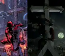 When the look of the film was being decided, Mark Steven Johnson opted to use direct scenes from the Daredevil comics. Joe Quesada's artistic take in Guardian Devil (Daredevil vol. 2, #1–#8) was an influence on the film, with Johnson noting that they would "literally take out a scene from the comic book that Joe did [...] Here's Daredevil on the cross, you know, it's that scene from 'Guardian Devil'. You just shoot that."[9] Throughout the film, Ben Affleck had to wear "cataract milky-blue" contacts, which would effectively make him blind. This was considered great by Johnson, as it would aid his performance.[36][37]
