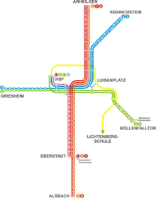 - "Information about tram connections to central Darmstadt" (PDF) (in German). DADINA. Archived from the original (PDF-Datei; 315 kB) on 18 April 2013. Retrieved 4 May 2012.