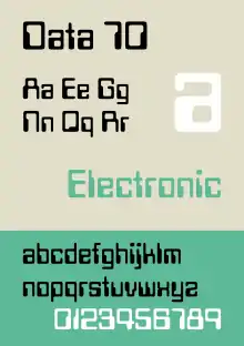 Data Seventy is a high-tech style font, with the look of old computer lettering, and was designed by Bob Newman of Letraset until it was acquired by ITC. Data Seventy gives any text a futuristic appearance.[1] It serves as a rival to Westminster, and is also used in several Cartoon Network animated shows like Dexter's Laboratory and Whatever Happened to... Robot Jones?.