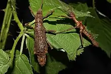 The way of life of the nocturnal animals, like the defense strategy, is geared towards mimetic. The animals often move slowly or not at all when touched for a long time. During the day, the phasmids usually hide in the leaves and at the foot of plants. To eat, they often only climb a few centimeters on the food plants. The females usually lay only a few, but relatively large eggs on or in the ground. With Epidares and some Orestes species it was observed that they prepare a hollow in the ground with the front legs, then the abdomen quickly over the front body let it fold, squeezing out an egg. This is catapulted forward, caught with the antennas and rolled over them into the trough, where it is then covered with earth by using the forelegs. It takes between two and six months for hatching. The nymphs always grow very slowly. Adults can live between one and five years.[4][7]