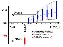 - ↑ Contrast real option valuation with the much lower valuation of an NPV calculation which results from summing all operating profits and launch costs, including negative outcomes, to derive a one-time average value.