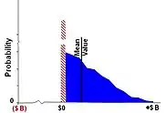 The DM real option employs the objective valuation formula where is the default threshold when it is economically rational to terminate (abandon) an opportunity event. If a simulation event (‘draw’) calculates a negative outcome (i.e., operating profits less than launch costs), then that event outcome should be rationally cut, or terminated, recording a residual. Only net positive economic outcomes are tallied. This operation leaves the misperception of ‘the odds being stacked’ favoring only positive outcomes seemingly resulting in an abnormally high valuation. However, the of the formula mathematically calculates the correct option value by adjusting these positive outcomes according to their likelihood, i.e., probability of a success (POS).[40]