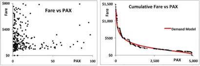 A demand curve can be realistically modeled using an inverse lognormal distribution which convolves the market price distribution estimate with the market size range.[35][36] A demand curve deftly models highly differentiated markets which through pricing distinguish selective product or service characteristics such as quality or grade, functional features, and availability, along with quantity sold. Examples are automobiles, shoes, smart phones, and computers. Airfare markets are highly differentiated where demand pricing and quantity sold are dependent on seasonality, day of week, time of day, routing, sale promotions, and seating or fare class. The airfare demand distribution pattern is well represented with an inverse lognormal distribution as shown in Fig. 10.