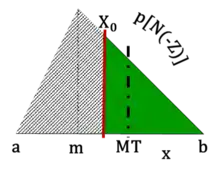 N(-Z) or N(d2) is a measure of the area of the tail of the distribution, MT (delineated by X0), relative to that of the entire distribution, e.g. the probability of tail of the distribution, at time T0. Fig. 5, Right. The true probability of expiring in-the-money in the real (“physical”) world is calculated at time T0, the launch or strike date, measured by area of the tail of the distribution. N(σ-Z) or N(d1) is the value of the option payoff relative to that of the asset. where MT is the mean of the tail at time T0.