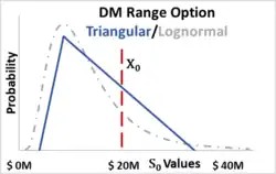 For a triangular distribution, sometimes referred to as three-point estimation, the mode value corresponds to the “most-likely” scenario, and the other two other scenarios, “pessimistic” and “optimistic”, represent plausible deviations from the most-likely scenario (often modeled as approximating a two-sided 1-out-of-10 likelihood or 90% confidence).[28][29][30][31] This range of estimates results in the eponymous name for the option, the DM Range Option.[32] The DM Range Option method is similar to the fuzzy method for real options. The following example (Fig. 7) uses a range of future estimated operating profits of a (pessimistic), b (optimistic) and m (mode or most-likely).