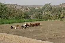 Date palm trees and Doum palms (Hyphaene thebaica) are perfectly adapted to the regional climate of Dar al-Manasir. They are drought resistant and can withstand the exceptionally hot dry and rainless summers and cold dry winters. The proximity of Ashu land to the river Nile makes the water table accessible to the deeply penetrating roots of fully grown palm trees throughout the year, making it the most valuable class of land.[4] Since dates constitute the most relevant cash crop in Dar al-Manasir their cultivation is not limited to Ashu land only, but expands along the irrigation channels of the Saqiah land. During recent years date trees even substitute seasonally irrigated crops such as wheat, beans and okra on the traditional Saqiah land.
