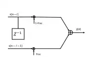 When going back in the time domain exploiting the inverse Z-transform, this corrsponds to , where is the Dirac delta. The former equation holds for but for the implementation we need a fractional delay, meaning . In this case, interpolation is required to reconstruct the value of the signal that lies between two samples.[4] One can resort to the preferred interpolation technique, e.g., Lagrange interpolation,[5] or all-pass interpolation.[6]