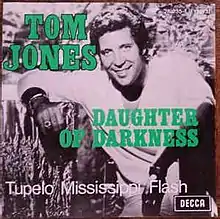 "Daughter of Darkness" is a single by Tom Jones released in 1970 from his album, I Who Have Nothing. The single was a top ten hit in the UK, peaking at number five. In the United States and Canada, Jones just missed the top ten with "Daughter of Darkness", peaking at number 13 and number 11, respectively. The song went to number one in the United States on the Billboard Easy Listening chart in June 1970, and was Tom Jones final of three number ones on the chart.[1] Elton John, who was working as a session musician at that time, also sang on the song.[2]