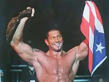 On the June 23 episode of Raw, Batista was drafted from SmackDown to the Raw brand during the 2008 WWE Draft.[98] After failing to win the World Heavyweight Championship from Edge at Night of Champions, Batista attacked Edge the following night on Raw, allowing CM Punk to cash in his Money in the Bank contract on Edge. This set up a title match between Batista and Punk at The Great American Bash which ended in a double disqualification after Kane interfered and attacked both men. The following night on Raw, Batista and Punk had a rematch, Batista won by disqualification after he was attacked by JBL. As John Cena came to the ring to fight JBL, he inadvertently punched Batista as JBL ducked. This started a program between Cena and Batista leading up to SummerSlam, for which a match was made official by Raw general manager Mike Adamle. This was the first time a match between the two would occur as they had each been on separate brands since they both debuted in 2002. On the August 4 episode of Raw, Batista and Cena won the World Tag Team Championship from Cody Rhodes and Ted DiBiase, making Batista a three-time World Tag Team Champion.[99][100] The next week on Raw, Batista and Cena lost the World Tag Team Championship back to Rhodes and DiBiase.[101] After losing the titles, the two had to be separated by multiple officials. Batista defeated Cena at SummerSlam, legitimating injuring Cena's neck in the process.[102] Batista then competed in the World Heavyweight Championship championship scramble match at Unforgiven and was eight seconds away from being a four-time world champion, but Chris Jericho snuck in and pinned Kane in the waning seconds. On October 26 at Cyber Sunday, Batista defeated Jericho for his fourth World Heavyweight Championship in a match in which Stone Cold Steve Austin was voted in as the special guest referee.[103] Batista's reign, however, only lasted eight days when Jericho won the title back in a Steel Cage match on the 800th episode of Raw on November 3.[104]
