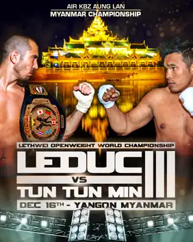 The rivalry started in 2016 and this bout was the third fight of the trilogy. Tun Tun Min was knocked out for over 40 seconds by an elbow of Leduc at 2:30 of the first round, and used his 2-minute injury time-out to get back in the fight.[5] The fight ended in a draw according to traditional rules and marked Leduc's 7th consecutive successful title defence.[6] Leduc was seen fighting out of the red corner, marking the first time in Lethwei history for a non-Burmese to fight from the red corner against a Burmese fighter.[7]