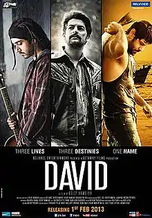 David is a 2013 Indian crime film directed by Bejoy Nambiar, starring Neil Nitin Mukesh, Vikram and Vinay Virmani in the title role, alongside Tabu, Monica Dogra, Lara Dutta and Isha Sharvani. The film was simultaneously shot in Tamil under the same title with Jiiva replacing Virmani while Vikram's portion was almost entirely dubbed.[2] The plot revolves around the lives of three different men named David, who are about to take a step which is going to change their lives forever.[3] Both the Hindi and Tamil versions were released on 1 February 2013.