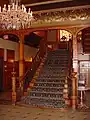 The Tiffany glass windows have been estimated to be worth more than the house itself.[7] The window designs often feature themes oriented around the purpose of the rooms they are located in. For example, the music room's windows are themed towards elements of music as well as images of Saint Cecilia, the patron saint of music. The grand staircase features a massive stained glass window portraying a knight, paying homage to the various members of the Whitney family who were knighted, as well as their relationship to the royal blood line in England. The house was the first residence in Detroit to have a functioning elevator for personal use.