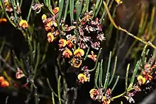 Daviesia nematophylla is a species of flowering plant in the family Fabaceae and is endemic to the south-west of Western Australia. It is a dense, erect shrub with glabrous foliage, erect, usually needle-shaped phyllodes, and yellow, orange and dark red flowers.