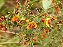- Daviesia ulicifolia subsp. incarnata G.Chandler & Crisp[14] has narrow elliptic, or narrow egg-shaped to linear phyllodes 9.5–22 mm (0.37–0.87 in) long and 1–3 mm (0.039–0.118 in) wide with one to seven flowers in leaf axils, the standard petal 7–8 mm (0.28–0.31 in) wide and reddish-orange with a dark red base and a yellow centre;[3][12]