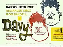 Davy is a 1958 British comedy-drama film directed by Michael Relph and starring Harry Secombe, Alexander Knox and Ron Randell.[2] It was the last comedy to be made by Ealing Studios and had the distinction of being the first British film in Technirama.[3] Davy was intended to launch the solo career of Harry Secombe, who was already a popular British radio personality on The Goon Show, but it was only moderately successful.[4]