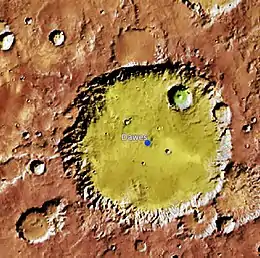 Dawes Crater is located in the Sinus Sabaeus quadrangle of Mars, at 9.2 S and 38 E.[1] It is about 191 km (119 mi) in diameter, and was named after William R. Dawes, a British astronomer (1799–1868)[1] who was ahead of his time in believing that Mars only had a thin atmosphere. Dawes presumed that the atmosphere of Mars was thin because surface markings on the planet could easily be seen.[2]