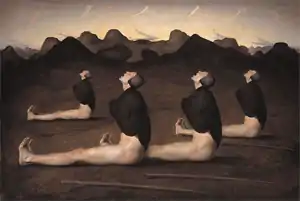 Dawn is a 1989 painting by the Norwegian artist Odd Nerdrum. It depicts four identical men in a grey rocky landscape. The men are seen from the side as they sit on the ground, with scullcaps and leather wrapped around their shoulders, and face the sky above them with closed eyes and open mouths.