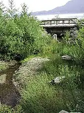 Located upstream from Spanish Banks waterfront, one of the highest profile creeks in Vancouver Metro became open to salmon in 2000. In a collaborative project between Spanish Banks Streamkeepers Association and the Department of Fisheries and Oceans Canada, barriers to fish passage were removed and habitat structure was added. Spanish Banks Creek was previously diverted through a culvert underneath a parking lot, but the lower reaches of this creek have been revitalized.[22] The banks were stabilized with riprap, large woody debris was added for habitat cover, and spawning gravels were added in appropriate areas. Rigorous effectiveness monitoring has not been performed, but a few dozen coho and chum salmon are known to spawn there annually in a sustaining population.[23] Maintenance to the creek is provided by Spanish Banks Streamkeepers Association, a local volunteer stewardship group.