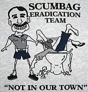 "Scumbag Eradication Team: Not in our Town!" are the words printed on a T-shirt used to raise money for the Daytona Beach Police Explorers Unit 22, a program which helps to mentor teenagers age 14–19 who are interested in a career in law enforcement.