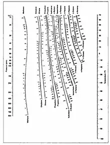 DePriester Charts provide an efficient method to find the vapor-liquid equilibrium ratios for different substances at different conditions of pressure and temperature. The original chart was put forth by C.L. DePriester in an article in Chemical Engineering Progress in 1953. These nomograms have two vertical coordinates, one for pressure, and another for temperature. "K" values, representing the tendency of a given chemical species to partition itself preferentially between liquid and vapor phases, are plotted in between.[1][2][3][4] Many DePriester charts have been printed for simple hydrocarbons.[5][6]