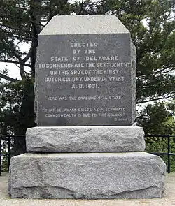 De Vries Palisade, also known as DeVries Palisade of 1631, is an archaeological site located at Lewes, Sussex County, Delaware. It is the site of the Zwaanendael Colony, the first permanent European presence on the Delaware Bay in 1631, settled by a group of settlers under David Pietersz. de Vries. The settlers landed near this spot to form a whale hunting station and agricultural settlement. A monument was erected on the site; it was dedicated on September 22, 1909.[2]