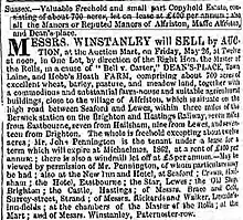 John Henry Tilson owned Watlington Park in Oxfordshire.[9] He lived there until his death. When he died he left his property including Watlington Park and Dean's Place to his only surviving child Maria Susan Tilson. In 1842 she married Thomas Shaen Carter[10] and the estates came under his ownership. The Tithe Map of 1843 records him as the owner. The couple retained ownership of Dean's Place until 1854 when it was advertised for sale. The advertisement is shown. At that time it was part of a large farming estate of over 700 acres.