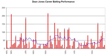 Jones began his first-class career in the 1981–82 season with Victoria in the Sheffield Shield. Jones also played for Durham and Derbyshire in the English County Championship.[2] Jones captained Derbyshire to second place in the 1996 County Championship, their best finish for 60 years. Jones scored 1,338 runs in the season, more than any other Derbyshire player.[3][4] He left Derbyshire mid-season in 1997 after disagreements with teammates.[3][4] Jones also had run-ins with authority and teammates in his home state of Victoria.[5] During his career, he scored 19,188 runs in first-class matches, including 55 centuries and 88 half centuries and a highest score of 324 not out, at an average of 51.85.[6]