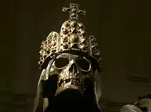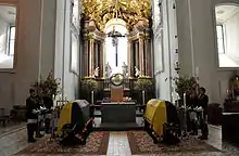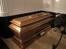 His funeral took place on 16 July 2011 in Vienna and on 17 July in Pannonhalma Archabbey, Hungary.[22] A 13-day period of mourning started in several countries formerly part of Austria-Hungary on 5 July 2011, when the body of Archduke Otto[2] was laid in repose in the Church of St. Ulrich near his home in Pöcking, Bavaria.[32] The body was transferred by train to the Catholic pilgrimage basilica in Mariazell on 12 July,[33] before being transferred by train to Vienna.[32] Requiem Masses were celebrated in three countries, in Munich, Pöcking, Mariazell, Vienna, and Budapest.[34] In accordance with the Habsburg tradition, his body and heart were buried separately.[35][36] Otto was entombed in the Imperial Crypt (Kapuzinergruft) together with his mother, wife and other family members.[37] His heart was buried in Pannonhalma Archabbey in Hungary.[22][38][39] Crown Prince Otto was educated by monks from Pannonhalma Benedictine College.[36] He was exiled from Austria and Hungary in 1918.