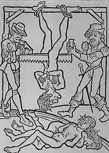 In only one case, the story about Simon the Zealot, the person is explicitly described as being hanged upside-down and sawn apart vertically through the middle, starting at the groin, with no mention of fastenings or support boards around the person, in the manner depicted in illustrations.[4] In other cases where details about the method beyond the mere sawing act are explicitly supplied, the condemned person was apparently fastened to either one or two boards prior to sawing.[3]