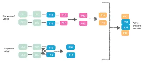 Procaspase-8, also a DED-containing protein, has affinity for the FADD DED. It's for that reason that they are recruited to FADD as monomers via their DEDs. These interaction is defined by α1/α4 of procapase-8 DED-A and FADD DED α2/α3 or α1/α4 of FADD DED and α2/α5 of procapase-8 DED-B. Procaspase-8 DED-B interacts with FADD and DED-A mediates capase-8 chain formation, or vice versa. However, in both cases the interaction leads to create a dimer between procaspases, which generates a conformational change. This dimerization is essential to create the active site; a p12 subunit is liberated and it is subsequently processed to the small p10 subunit. The two molecules of procapase-8 are associated with these p10 subunits creating an active protease-8 cell death.[7][8]