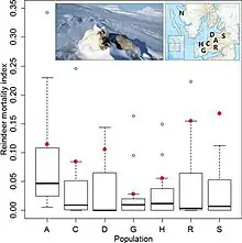 Current climate change influences species survival in a given area. Some of the first studies of the influence of climatic variables on wild mammals took place in the United States in 1960s. They analysed the impacts of severe winter weather events on the survival and reproduction of species such as Missouri cottontails and northern Montana Pronghorns.[42][43], sometimes using radio transmitters.[44] As the warming progressed, such severe winter weather decreased,[45] and instead, warming of previously very cold places, such as the High Arctic can wreak havoc with the ecosystems. For instance, warming-driven increase in precipitation causes warm rain to fall onto the permafrost, which becomes unstable and can collapse from the mountainsides in avalanches. On multiple instances, this has blocked the winter food supply of reindeer populations, and led to their mass starvation in places like the Svalbard of Norway and the Yamal Peninsula of Russia: in the latter area, 61,000 reindeer died over the 2013-2014 winter as the result.[41][46]