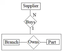 In the entity relationship diagram, aggregation is represented as seen in Figure 1 with a rectangle around the relationship and its entities to indicate that it is being treated as an aggregate entity.[3]