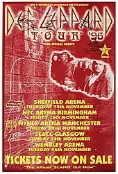 The Slang World Tour was a worldwide concert tour by English hard rock band Def Leppard in support of their album Slang, which was released in May 1996. Although Slang was the first Def Leppard album to feature new material with guitarist Vivian Campbell, this was his second tour with the band. Campbell joined Def Leppard just prior to their Adrenalize World Tour in 1992.[1]