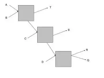 As an example consider the network shown above, in here and are users (senders), , and are servers (receivers), the boxes are mixes, and , and where denotes the anonymity set. Now as there are pool mixes let the cap on the number of incoming messages to wait before sending be ; as such if , or is communicating with and receives a message then knows that it must have come from (as the links between the mixes can only have message at a time). This is in no way reflected in 's anonymity set, but should be taken into account in the analysis of the network.