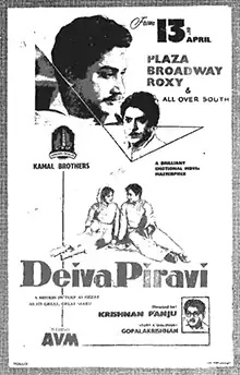 Deivapiravi (transl. Noble Soul) is a 1960 Indian Tamil-language film, directed by Krishnan–Panju. The film stars Sivaji Ganesan, Padmini, S. S. Rajendran, K. A. Thangavelu and M. N. Rajam. The film was dubbed and released in Telugu as Anumanam and released on 24 June 1961.[1] At the 8th National Film Awards, the film won the All India Certificate of Merit for the Third Best Feature Film.[2] It was remade the same year in Hindi as Bindya, and in 1965 in Sinhala as Sekaya.