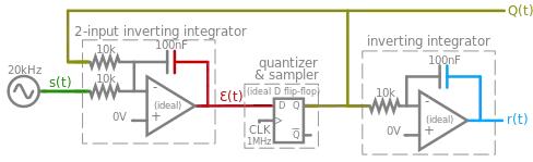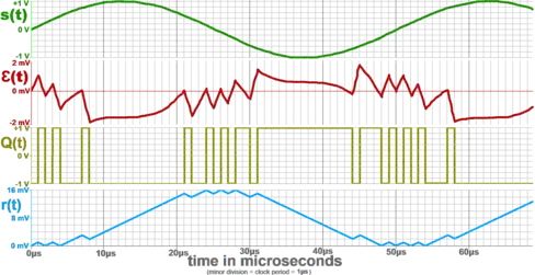 The Greek letter epsilon is used because Ɛ(t) contains the accumulated error that is repeatedly corrected by the feedback mechanism. While both its inputs s(t) and Q(t) vary between -1 and 1 volts, Ɛ(t) instead only varies by a couple millivolts about 0 V.