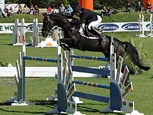 The Selle Français is a French sport horse,[4][19] now recognized internationally as a top breed for show jumping and three-day eventing.[4][5] Selection criteria for breeding stock focuses on their jumping abilities. Show jumping is a technical sport, calling for lively and responsive yet powerful horses. Horses with more Thoroughbred blood in them have also been very competitive in three-day eventing, where speed and stamina are needed to be successful in all three portions (dressage, three-day eventing and show jumping) of the event.[20] Thanks to these qualities, the Selle Français is seen on international show jumping and three-day eventing teams, both in France and elsewhere.[21] In dressage, the Selle Français has gradually improved,[4] but has faced stiff competition from northern European breeds, which often have more active gaits. In addition, many French breeders guide their horses to the more popular and profitable sport of show jumping, which sometimes deprives the dressage system of good horses.[22] The World Breeding Federation for Sport Horses (WBFSH) ranks warmblood stud books based on their success in eventing, show jumping and dressage. In 2013, the ANSF was ranked as the 3rd best show jumping stud book in the world, topped only by the Dutch Warmblood and Belgian Warmblood breeds, and a Selle Français horse was ranked first in the world.[23] The stud book was ranked at 6th in the world in eventing, with the top horse placed at 25th.[24] The ANSF was ranked 19th in dressage, beaten by many of the more popular dressage breeds, including Dutch Warmbloods, Hanoverians and Westphalians.[25]