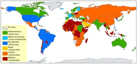 - ↑ Alvarez, M.; Cheibub, J. A.; Limongi, F.; Przeworski, A. (1996). "Classifying political regimes". Studies in Comparative International Development. 31 (2): 3–36. doi:10.1007/bf02719326. S2CID 154376266.