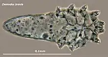 Demodex brevis is one of the two species of face mite that inhabit humans (the other being Demodex folliculorum). They are about half as long, at 0.15 to 0.2 mm (6 to 8 thousandths of an inch),[1] as D. folliculorum, but otherwise have few differences. Most of the article on Demodex folliculorum applies equally to D. brevis.