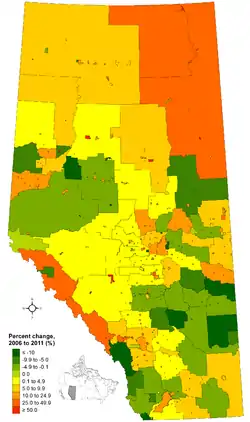 - ↑ "Population and dwelling counts, for Canada, provinces and territories, and census subdivisions (municipalities), 2011 and 2006 censuses (Alberta)". Statistics Canada. Retrieved April 3, 2012.