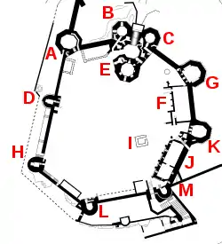 The walled circuit recommences in the north-east corner of the town, where the walls survive up to 15 feet (4.6 m) high, further protected by the two-storey tall North-Eastern Tower.[85] On the eastern side of the walls, the original defences had been set back from the edge of a rocky salient, protected by the Countess Tower, an angular, two-storey building with two towers.[86] The defences were adapted to follow the outer edge of the salient, with the Goblin Tower built on the outermost point, overlooking the edge of the cliffs.[86] The Goblin Tower is a hexagonal, two-storey tower, protecting a deep well that formed the only reliable source of water for the defences during the summer.[87]