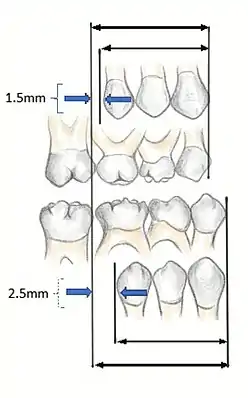 In order to fully understand the development of occlusion and malocclusion, it is important to understand the premolar dynamics in the mixed dentition stage. The mixed dentition stage is when both primary and permanent teeth are present. The permanent premolars erupt ~9–12 years of age, replacing the primary molars. The erupting premolars are smaller than the teeth they are replacing and this difference in space between the primary molars and their successors (1.5mm for maxillary, 2.5mm for mandibular[7]), termed Leeway Space. This allows the permanent molars to drift mesially into the spaces and develop a Class I occlusion.
