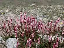 Polygonum affine, Thalictrum alpinum, Bromus oxyodon, Saxifraga flagellaris, Androsace mucronifolia, Aster flaccidus, Barbarea vulgaris, Artemisia maritima, Elymus longiaristatus, Nepeta connata, Carex cruenta, Ranunculus laetus, Arenaria neelgherrensis, Astragalus leucocephalus, Polygonum amplexinade, Echinops niveus, Senecio chrysanthemoides, Artemisia spp., Dracocephalum nutans, Taxus contorta, Chrysopogon gryllus subsp. echinulatus and Dianthus crinitus. There were also observed some medicinal plants which are locally famous i.e. Thymus linearis (Reetumburuk),[7]: 11 Saussurea lappa (kuth), Ephedra gerardiana (Say),[7]: 9 Viola pilosa (Skora-mindoq),[7]: 11 Pleurospermum candollei (Shamdun)[7]: 10 and Artemisia brevifolia (Bursay)[7]: 8 etc. which are used as traditional drug therapies.