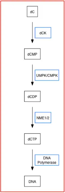 Deoxycytidine kinase (dCK) is an enzyme which is encoded by the DCK gene in humans.[5] dCK predominantly phosphorylates deoxycytidine (dC) and converts dC into deoxycytidine monophosphate. dCK catalyzes one of the initial steps in the nucleoside salvage pathway[6] and has the potential to phosphorylate other preformed nucleosides, specifically deoxyadenosine (dA) and deoxyguanosine (dG), and convert them into their monophosphate forms.[7] There has been recent biomedical research interest in investigating dCK's potential as a therapeutic target for different types of cancer.[6][7][8]