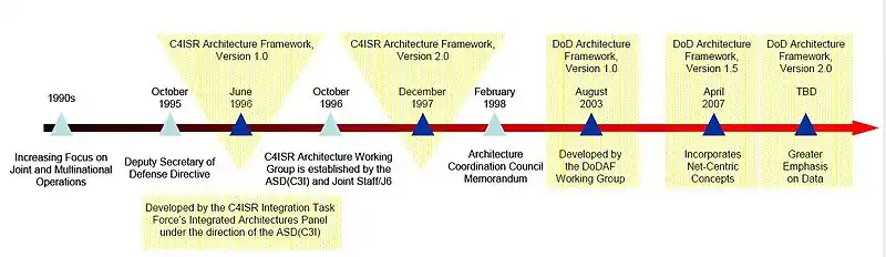 Evolution of the DoDAF since the 1990s. The DoDAF V2.0 was released in May, 2009.[1]
