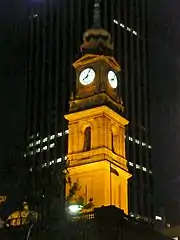 The basement has three entrances: the main entrance in Bridge Street, and two others in Gresham Street (one originally used for carriage). The façades are of dressed Pyrmont sandstone with cornices and balusters at each floor level, with a dome and tower tops made from copper.[1] The four façades are all richly decorated with classical motifs and statuettes and are dissimilar to each other. Barnet's mix of the orders and their integration into the building is significant. For example, the lowest level of the building is adorned with Doric and Ionic pilasters, whereas Corinthian and Ionic ones are used above. The clock tower has an 'onion' copper dome which was influenced by Sir Henry Parkes's water carafe.[7]